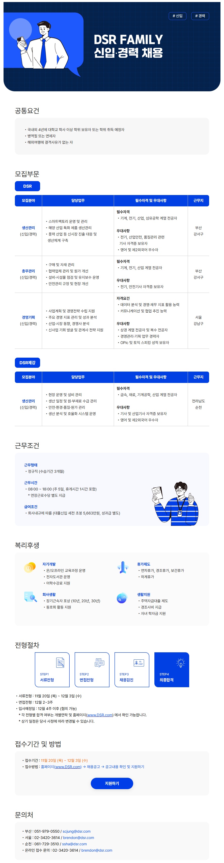 DSR이 미래를 함께 열어갈 인재를 모집합니다. 채용공고명 모집기간 DSR FAMILY 신입∙경력 채용 (생산관리, 총무관리, 경영기획) <2차면접 결과 발표> 2025.11.20 ~ 2025.12.03 채용마감