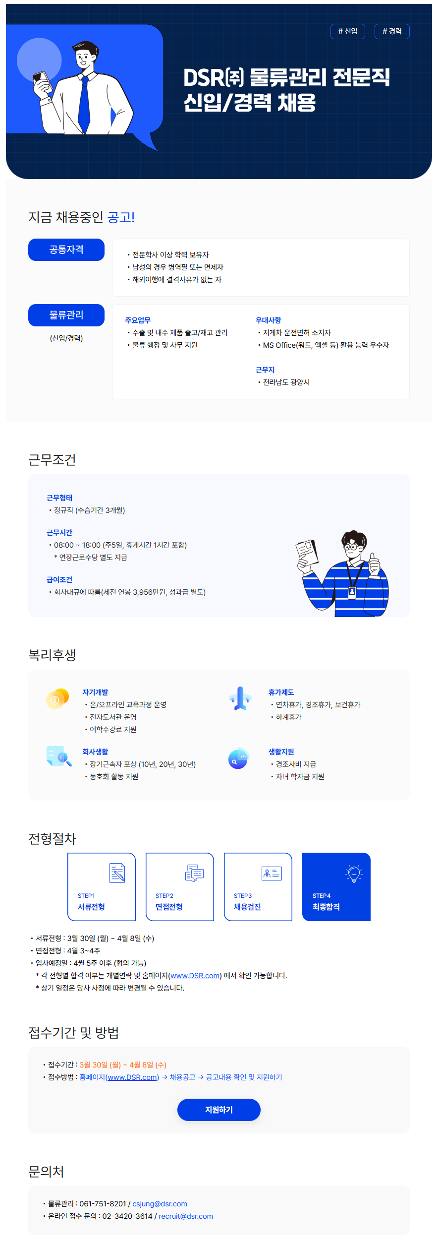 DSR이 미래를 함께 열어갈 인재를 모집합니다. 채용공고명 모집기간 2026년 물류관리(총무) 전문직 신입/경력 채용 <최종결과 발표> 2026.03.30 ~ 2026.04.08 채용마감